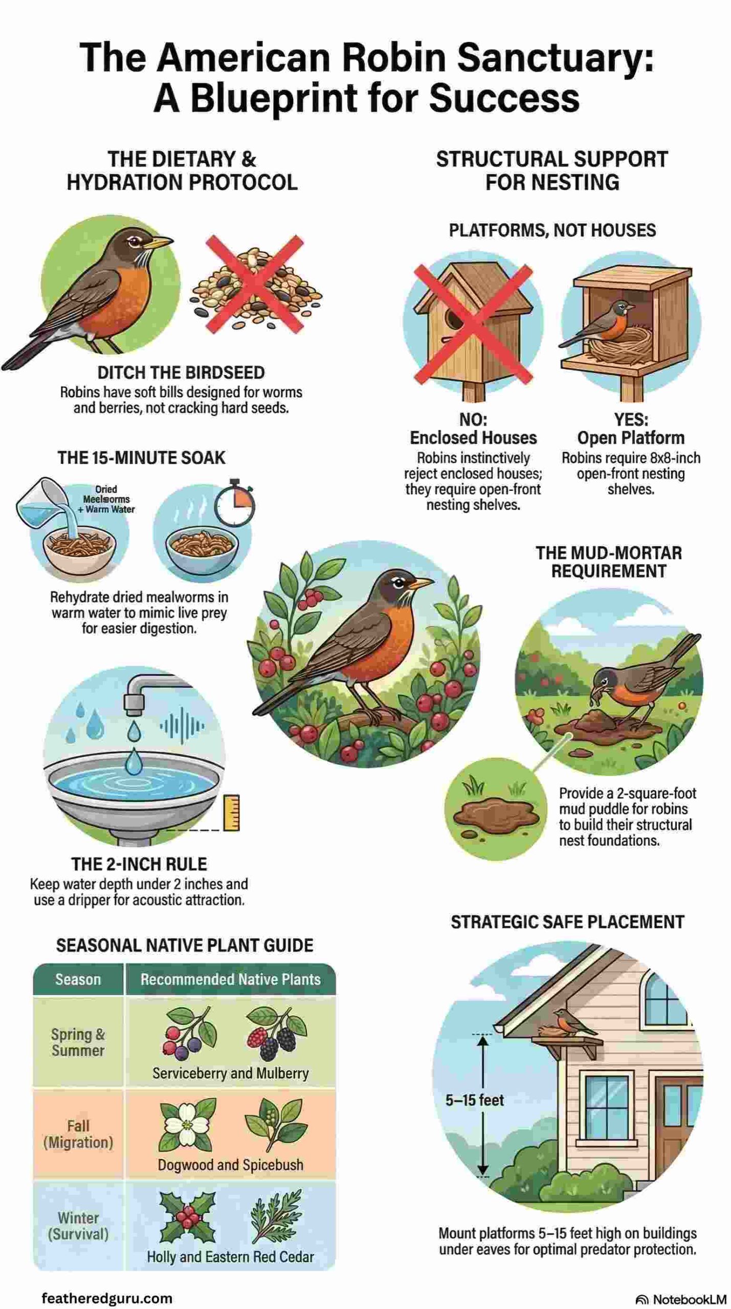 Mastering the shift from site selection to fledgling support is easier when you can see the entire cycle in one place. Use our comprehensive infographic below as a quick-reference guide for nesting shelf dimensions, mud-station setups, and the critical ‘Safe Placement’ checklist to ensure your yard remains a successful robin sanctuary
