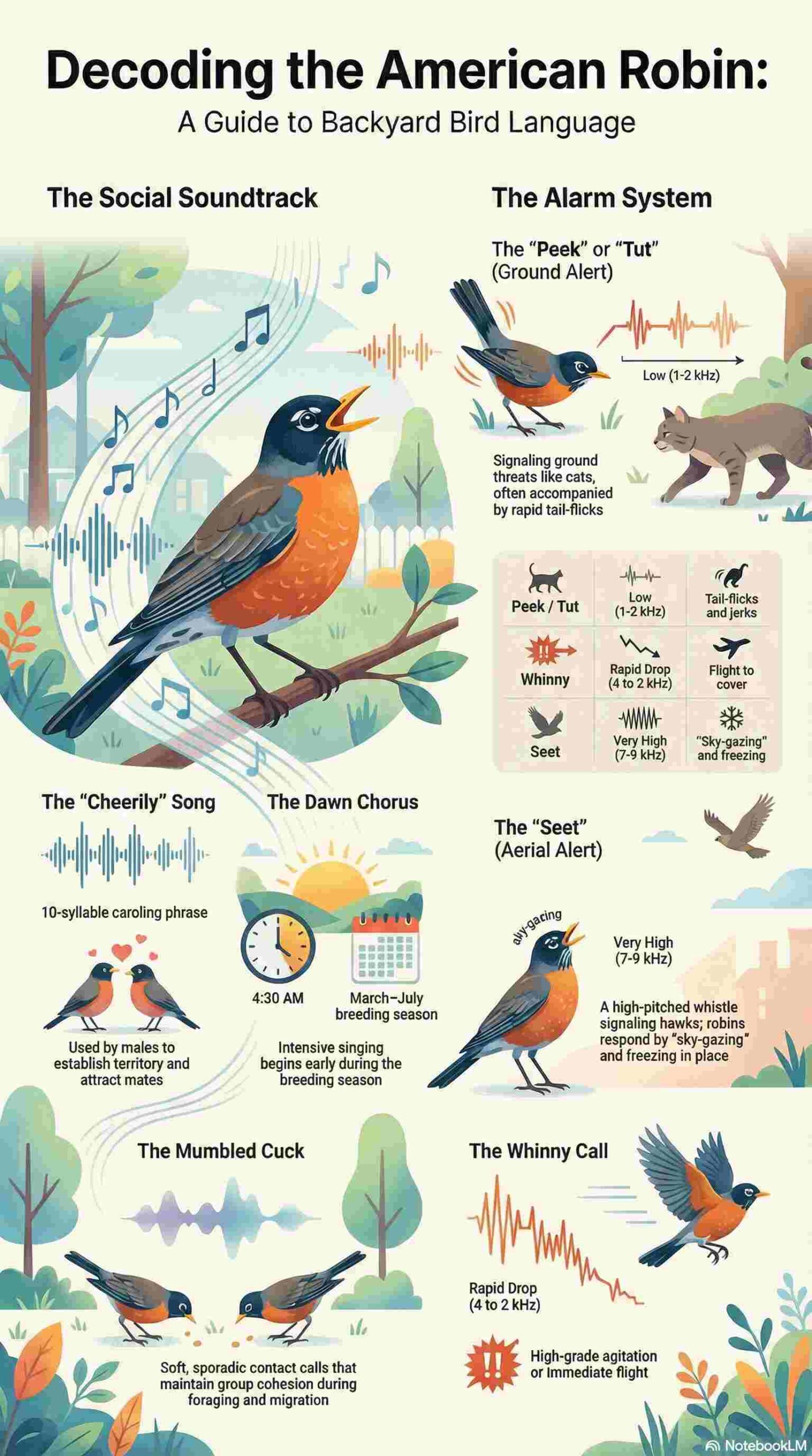 To help you identify these birds in the field, I’ve created a quick-reference infographic below. This visual ‘cheat sheet’ summarizes the 7 key American Robin vocalizations and their meanings, making it easy to decode backyard bird language in seconds.