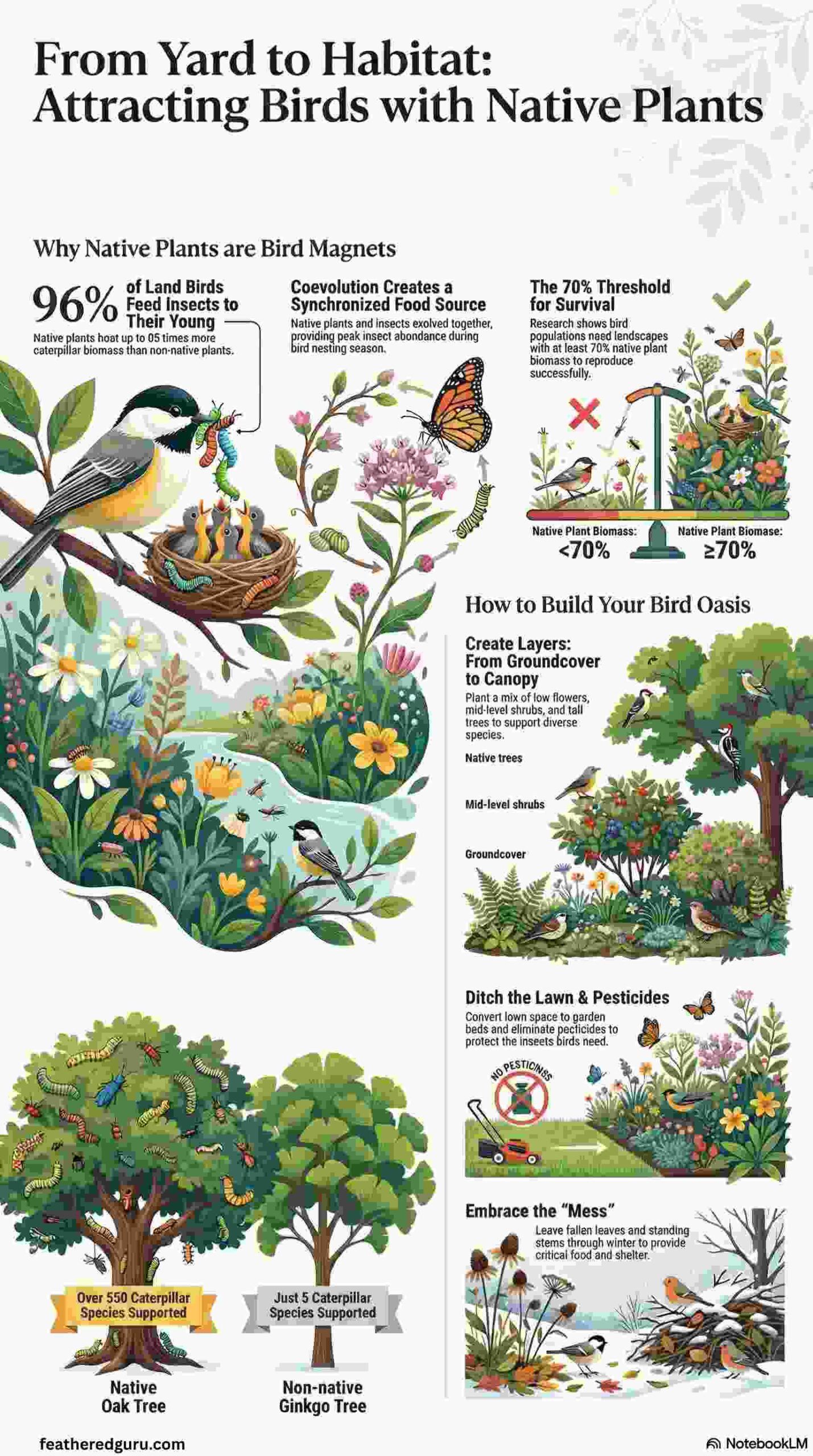 Attracting spring birds through strategic plant selection requires understanding that birds need functional ecosystems, not ornamental displays. The 70% native plant threshold, established through peer-reviewed research, provides a clear target that dramatically increases chances of attracting diverse species during migration and breeding.