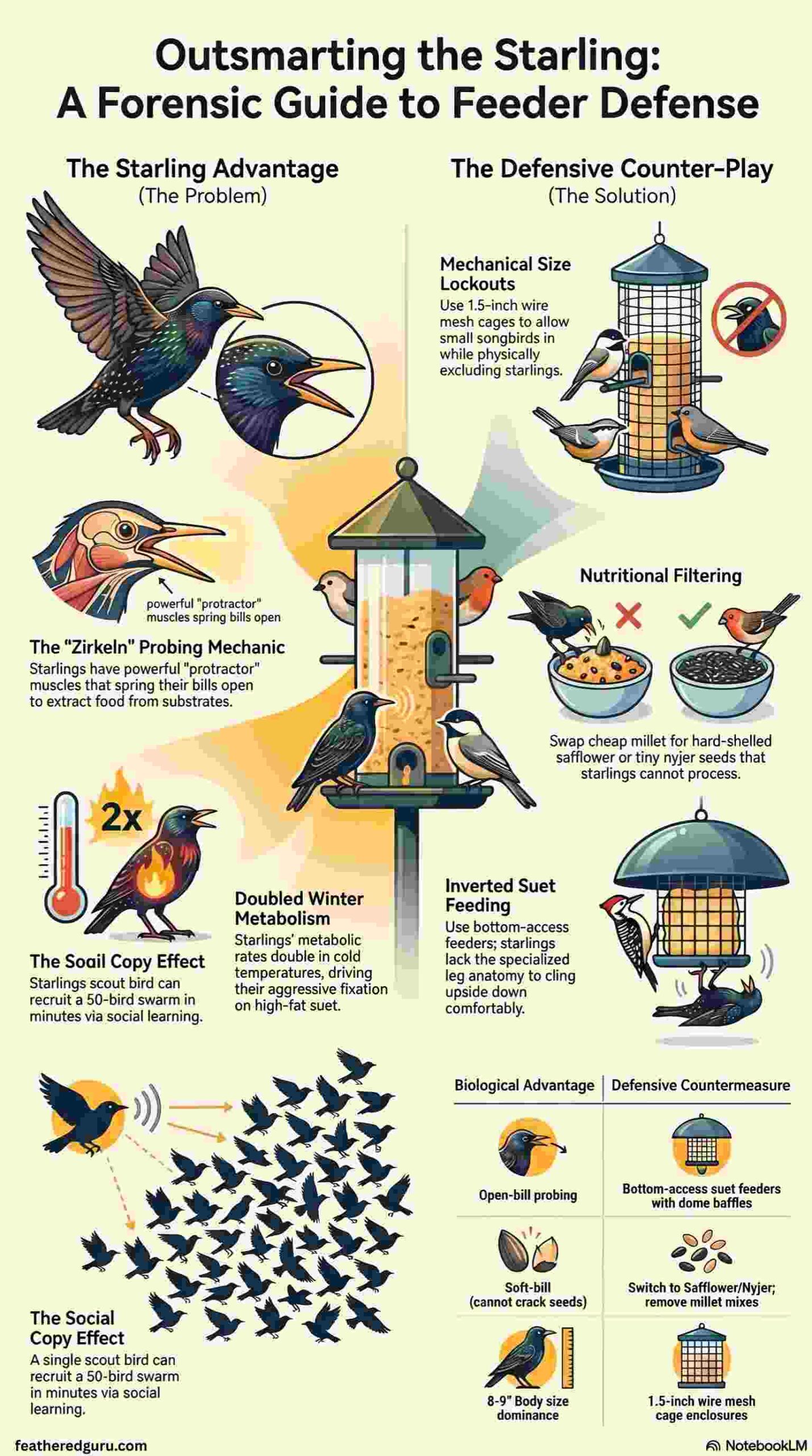 European starlings succeed at backyard feeders because of a specific set of biological advantages: protractor jaw muscles that allow open-bill probing, a soft bill that makes high-fat soft foods the ideal fuel, a winter metabolic need that drives fixation on suet and high-calorie supplements, and a social learning system that amplifies a single food discovery into a flock-level response. Each of these advantages has a corresponding defensive countermeasure.