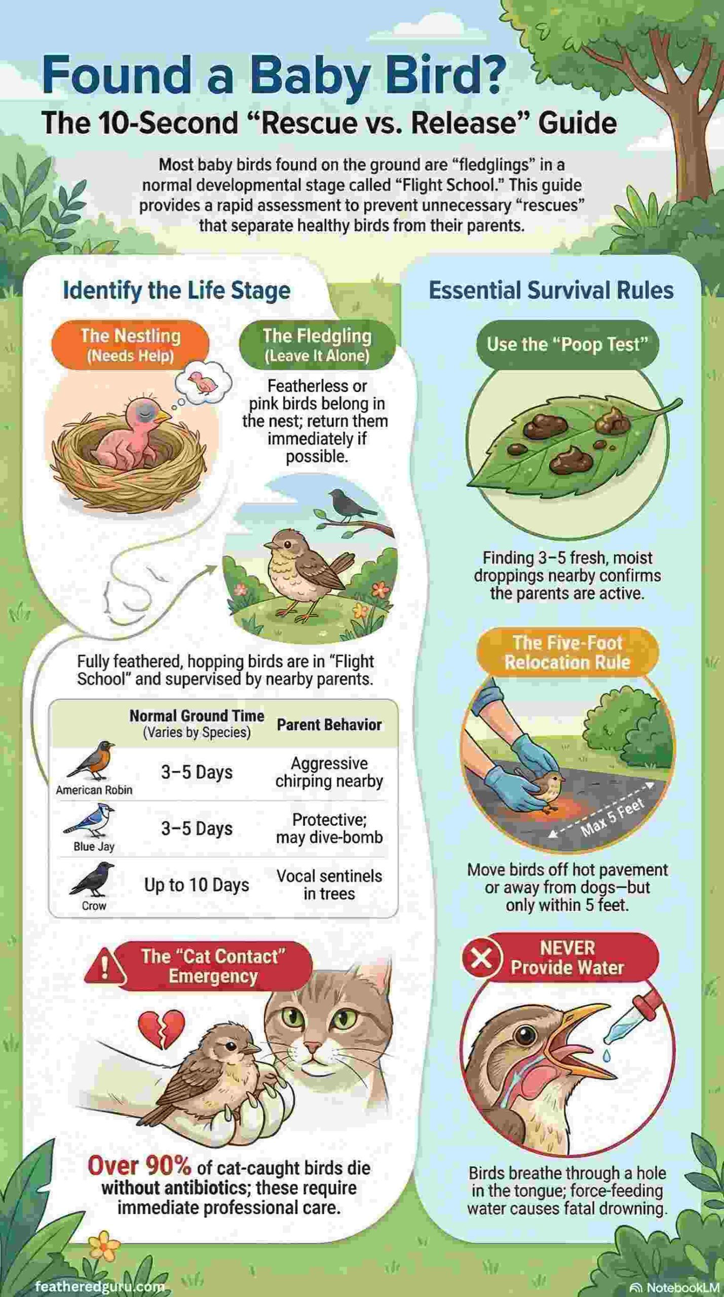 This guide shows you how to quickly decide when a baby bird needs help or should be left alone. You’ll learn the 10-second assessment, why cat contact causes hidden medical emergencies, how the poop test proves parental care, and the five-foot relocation rule to keep birds safe without separating families. You’ll also clearly spot the difference between a nestling that needs immediate intervention and a fledgling that needs you to step back 🙂.