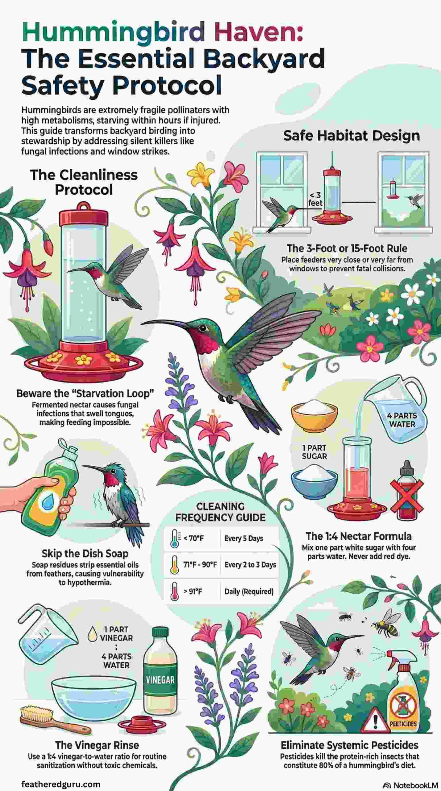 - Keep hummingbirds safe by avoiding fermented nectar, red dyes, and chemicals.