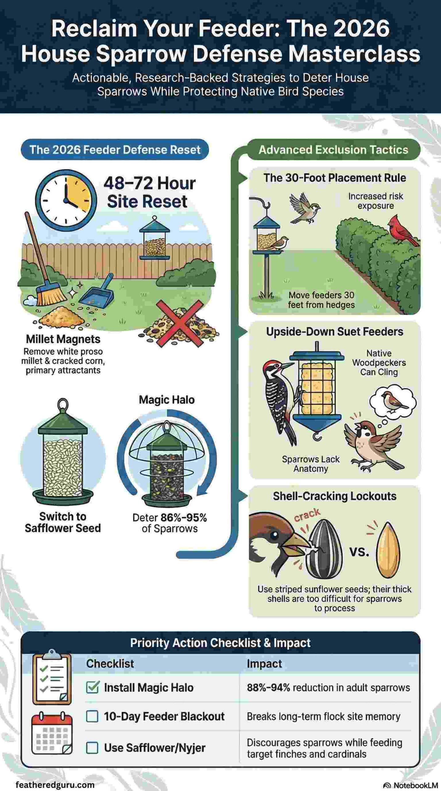 To immediately stop a House Sparrow takeover, implement a two-step reset: switch your primary feeder to safflower seed and install a Magic Halo (weighted monofilament lines). This combination exploits the sparrow’s aversion to bitter shells and vertical obstacles, deterring 86%–95% of adult sparrows while allowing cardinals, finches, and chickadees to feed normally. Clean all ground spillage and remove millet-based mixes to break the flock’s site fidelity within 48–72 hours.