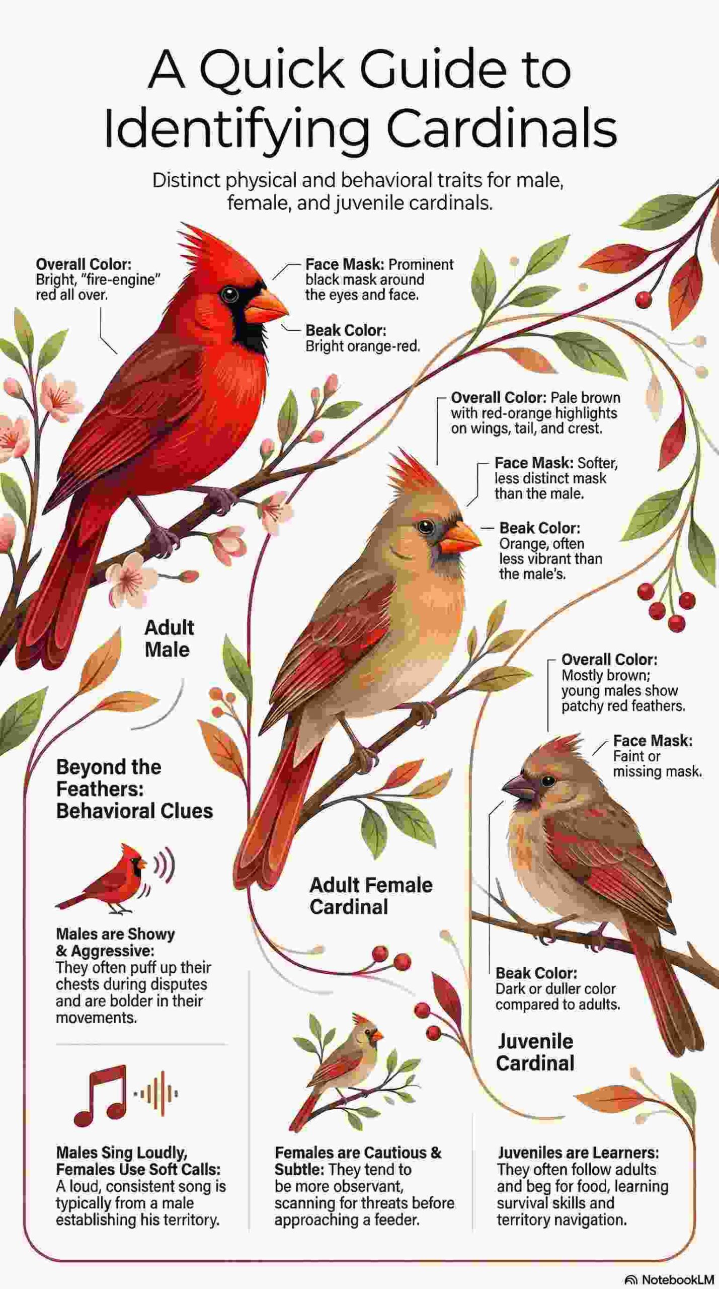 Here’s an easy visual guide summarizing the key differences between male, female, and juvenile cardinals—perfect for a fast backyard check.