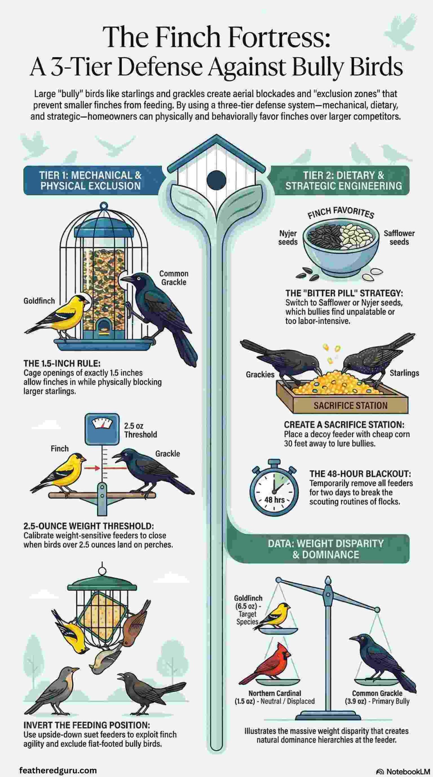 Tier One: Mechanical Exclusion. Use physics to favor nimble finches. Caged feeders with 1.5-inch openings allow finches to enter while blocking larger birds like Starlings and grackles. Weight-activated feeders set around 2.5 ounces let small birds feed safely, while heavier bullies trigger closure of seed ports.