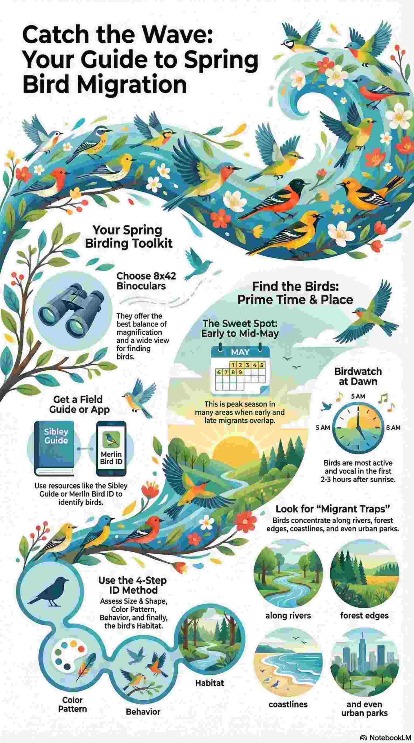 This infographic highlights key migration timings, common spring species, and must-have birding tools, giving you a quick visual guide to make the most of your spring birdwatching adventures.