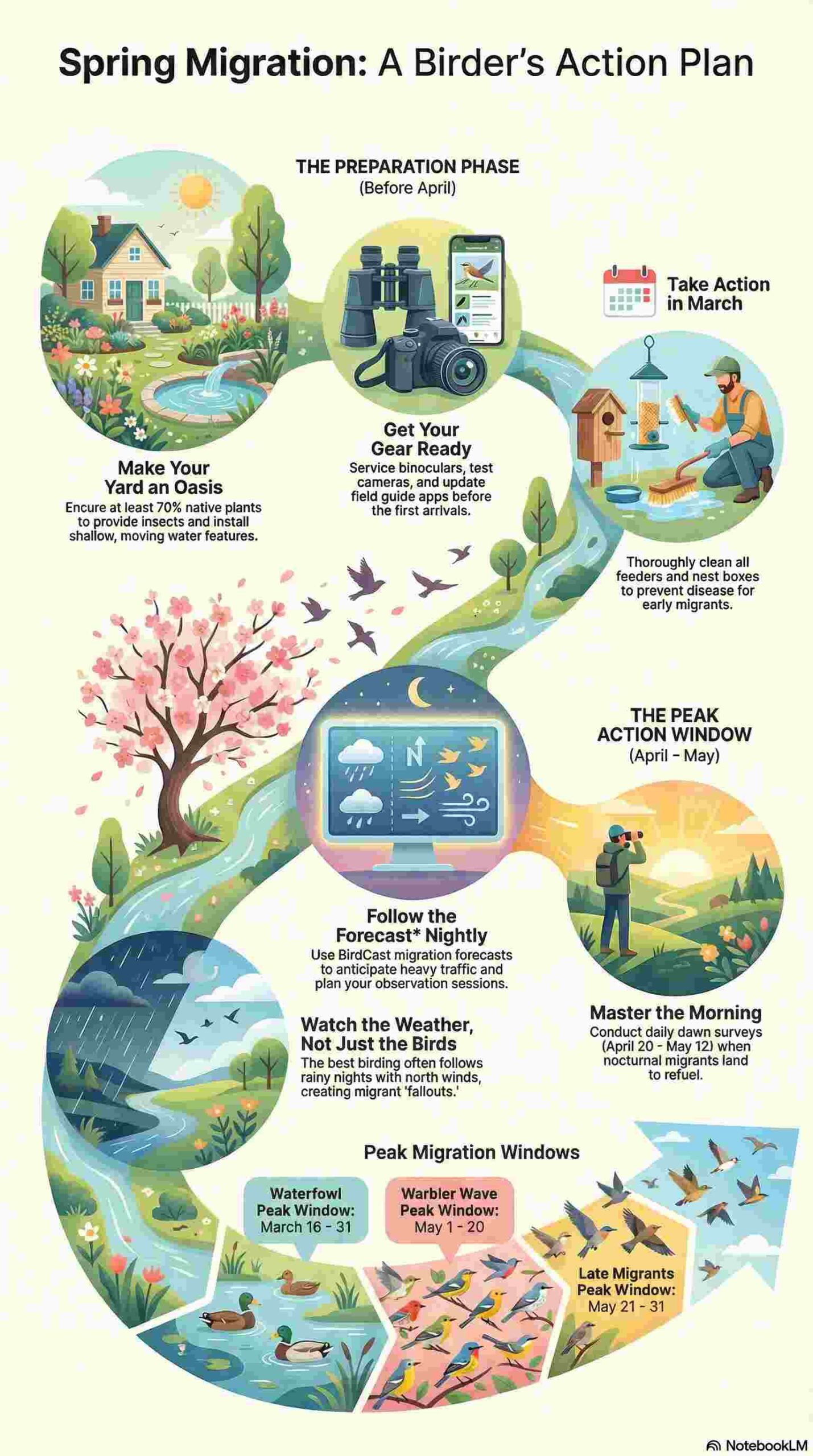 Spring migration rewards systematic preparation over casual observation. The compressed timeline when billions of birds pass through backyards demands advance planning, daily monitoring, and strategic timing capitalizing on weather-driven concentration events.