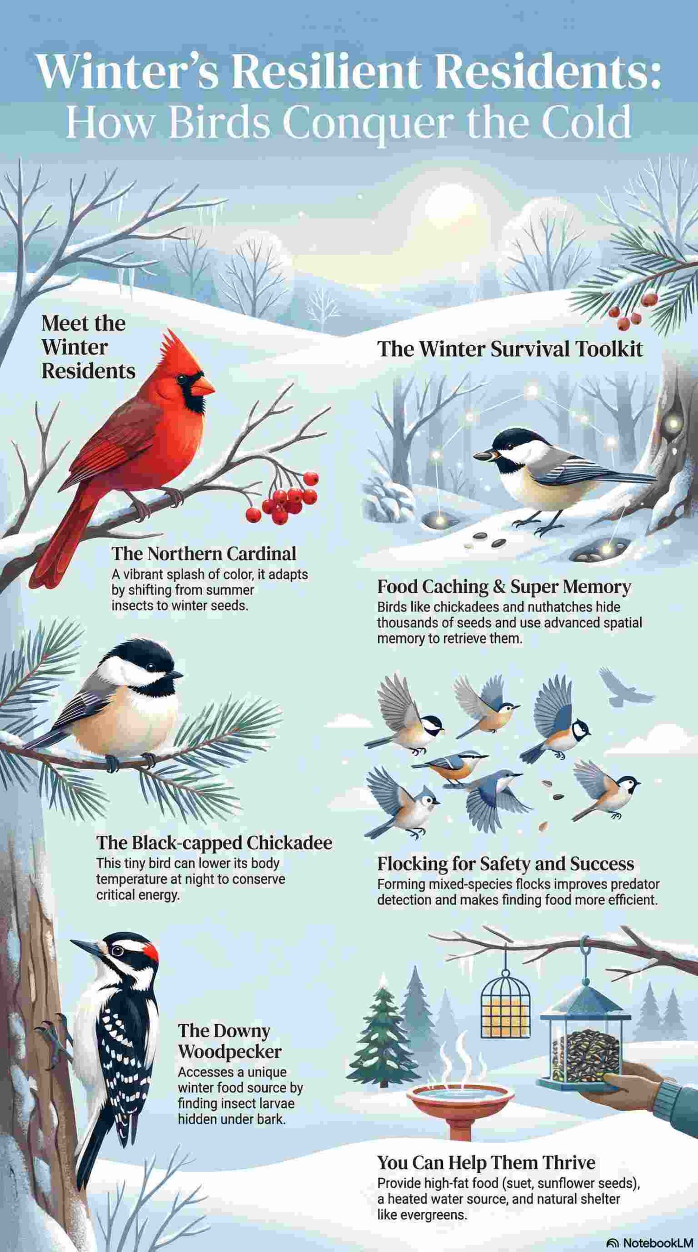 To give you a quick visual overview, this infographic highlights the birds that stay active in winter, where they’re commonly found, and the strategies they use to survive harsh conditions.