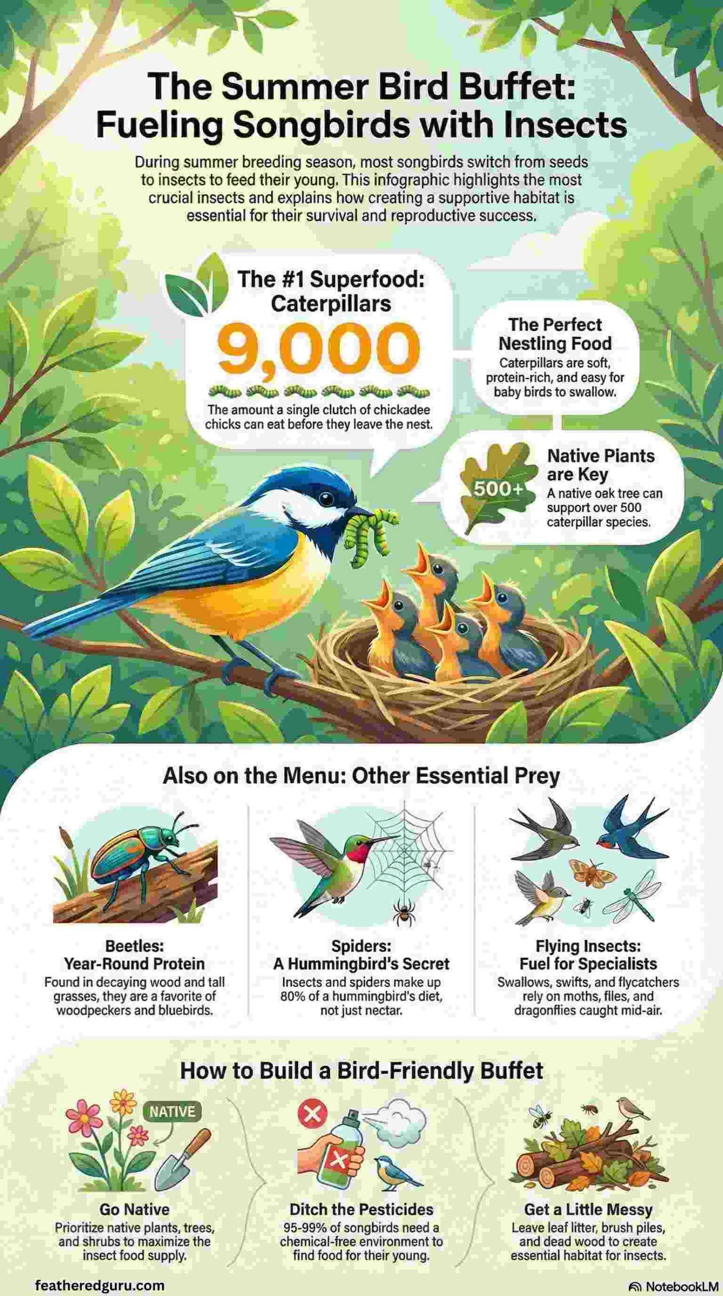 Ever wondered what insects attract birds in summer? Most songbirds shift from seeds to protein-rich prey like caterpillars, beetles, spiders, and other arthropods during the breeding season. Understanding which insects appeal to specific species can transform your garden into a productive summer bird habitat, helping parent birds raise healthy broods that may consume thousands of insects per nesting attempt.